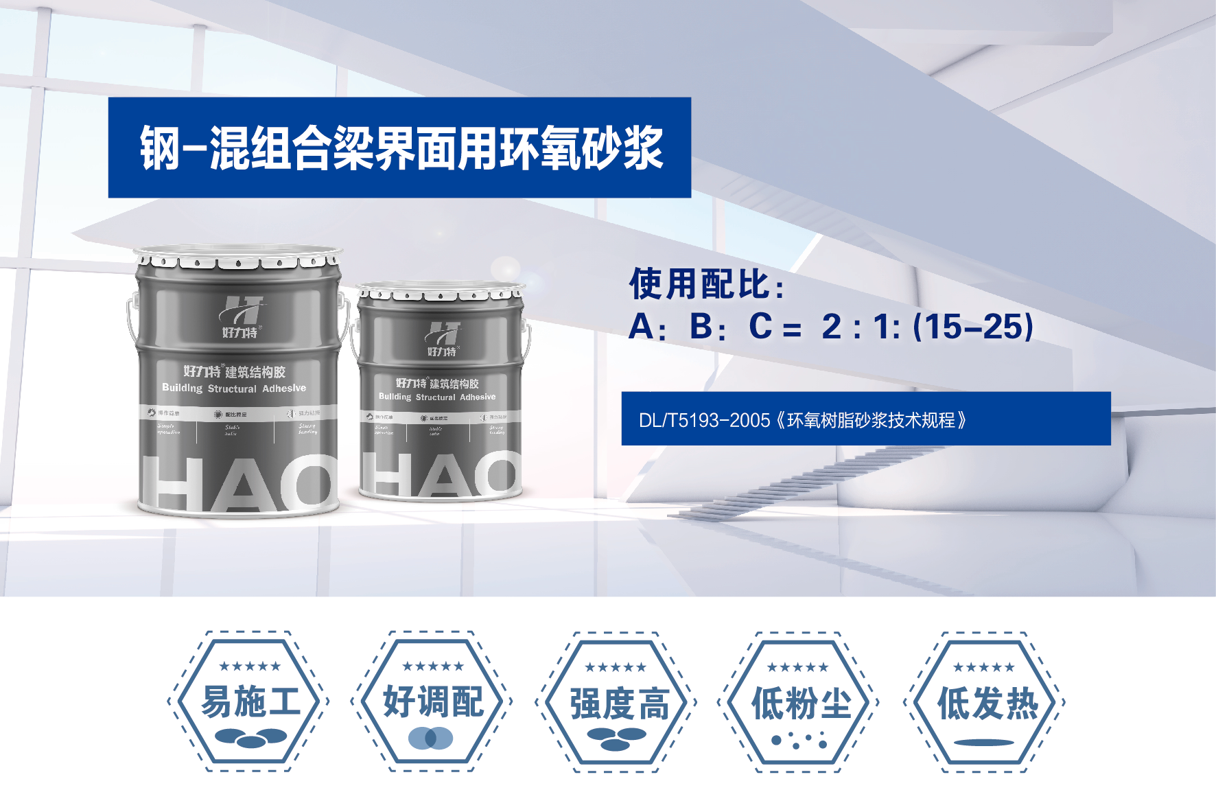 产品主要原材料为高性能环氧树脂和改性胺、高强度石英粉三组份而成,主要应用在钢-混组合梁浇铸施工必须使用一种界面材料,将钢与混凝土粘接在一起,起到一体作用的粘接目的,减少栓钉应力,增强抗剪连接作用。