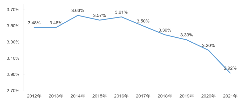 建筑业的产值利润率,自2014年达到最高点3.63%后逐年走低,2021年产值利润率为2.92%,已跌破3%。建筑业作为传统行业,利润率本就不高,而利润率的逐年走低对建筑企业来说无疑更是雪上加霜。